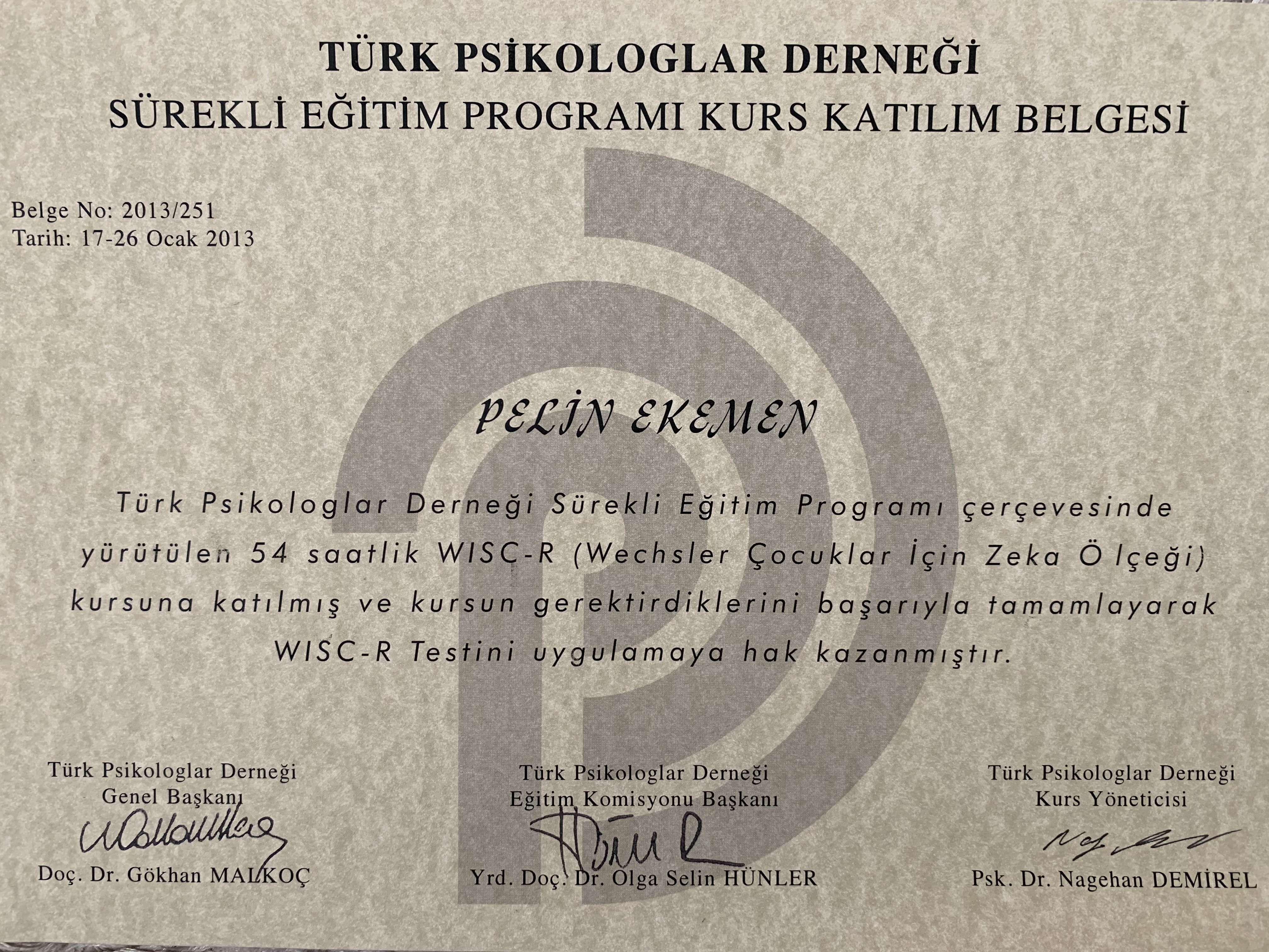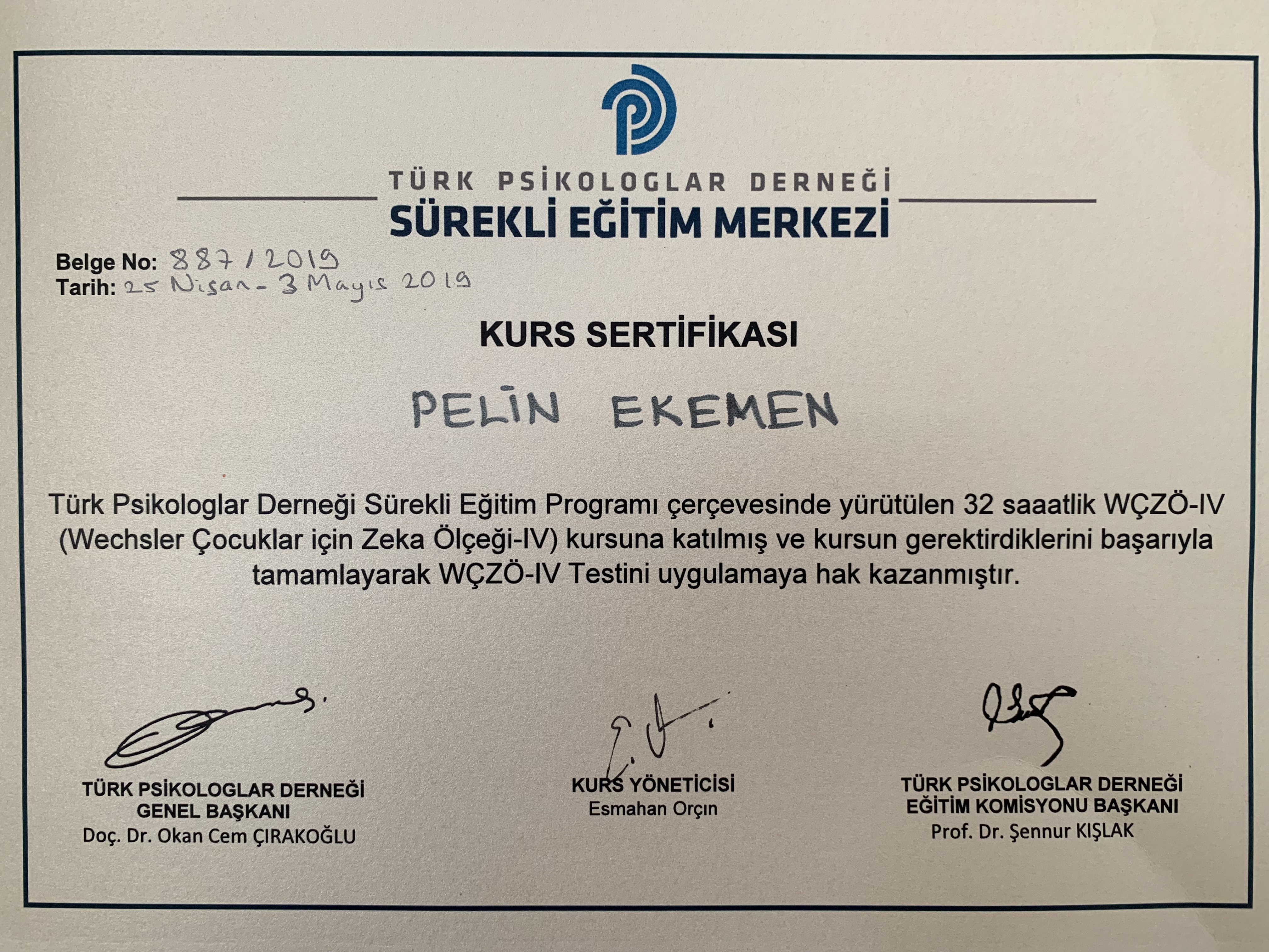 2019: Wechsler Çocuklar İçin Zeka Ölçeği (WISC 4) Uygulayıcı Sertifikası