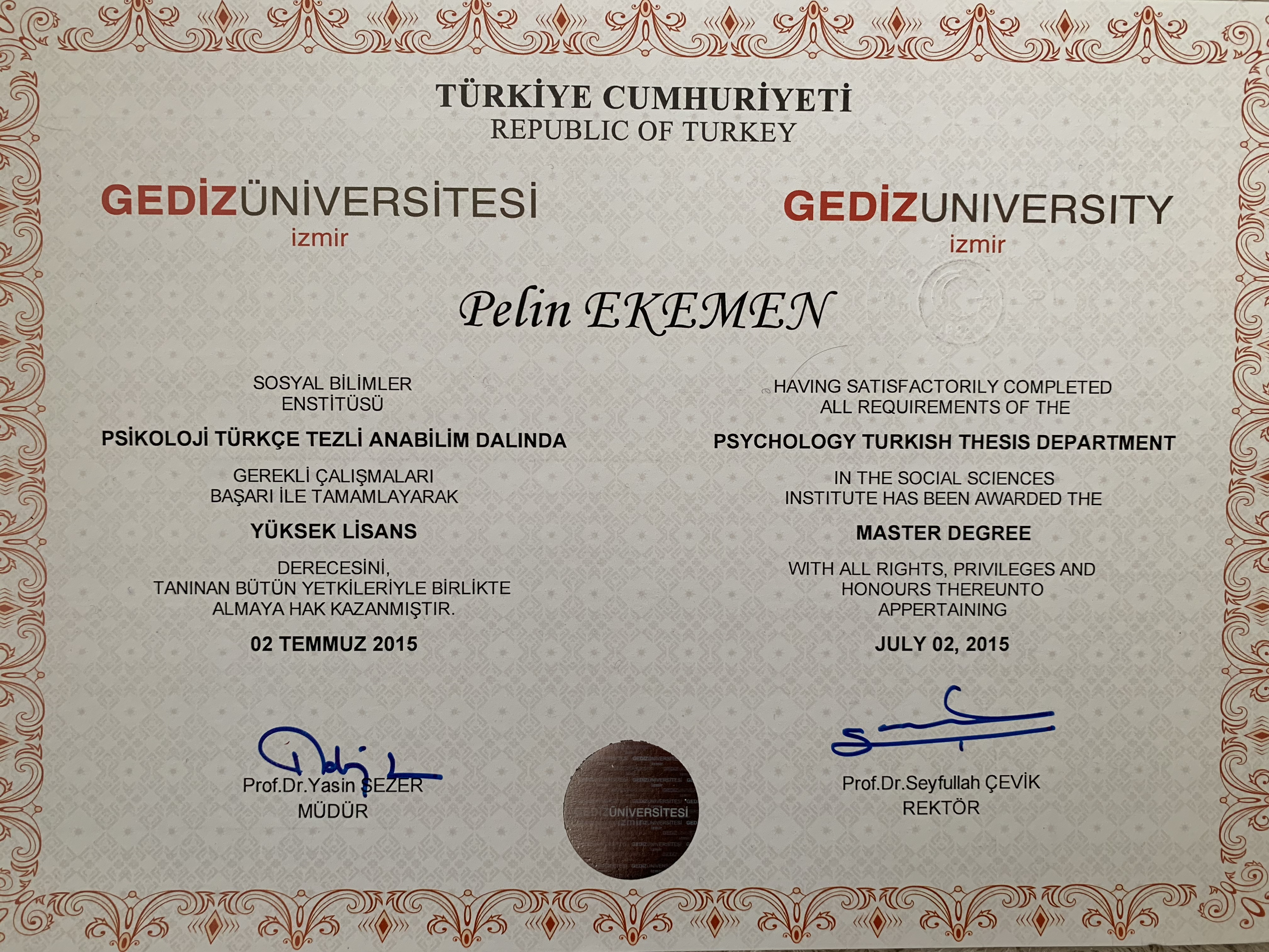 2013-2015 : Gediz Üniversitesi, Psikoloji Tezli Yüksek Lisans