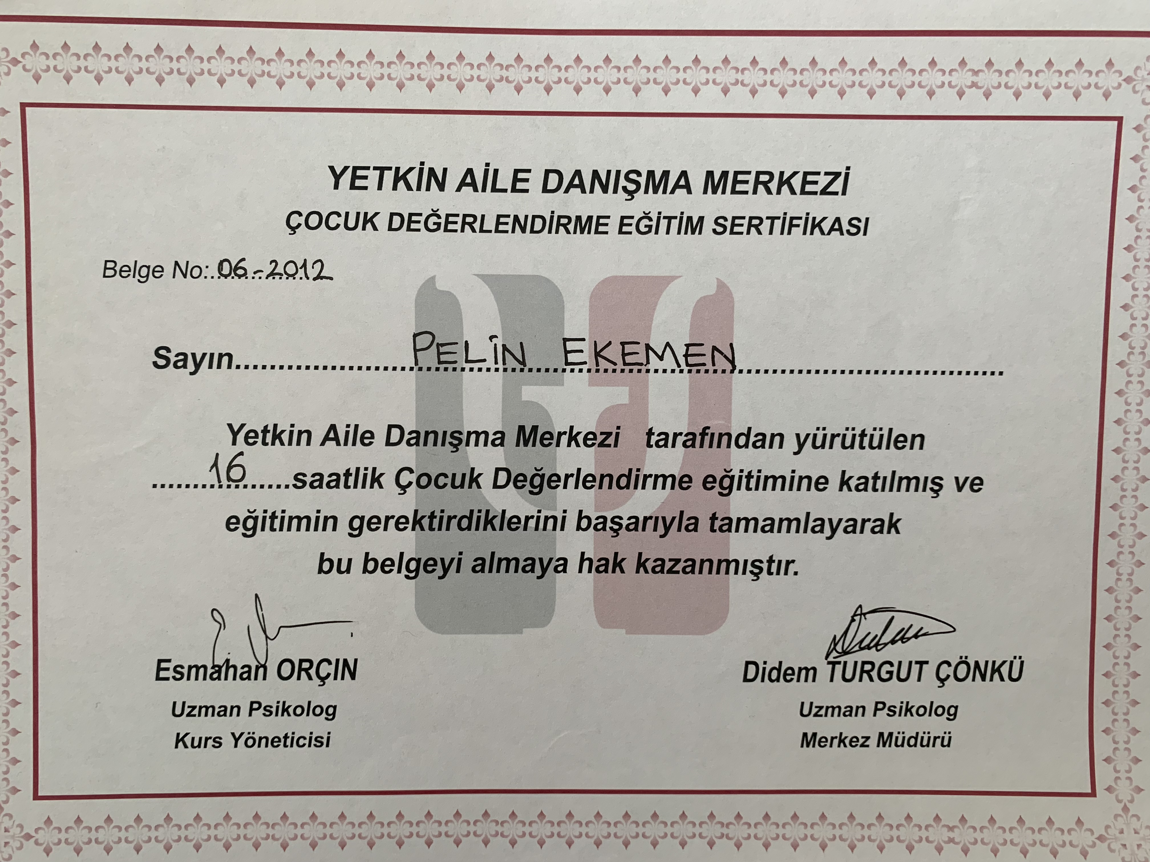 2012: Çocuk Gelişimini Değerlendirme Testleri Eğitimi (Ankara Gelişim Tarama Envanteri, Metropolitan Okul Olgunluğu Testi, Gesell Gelişim Figürleri Testi, Peabody Resim Kelime Tanıma Testi, Bender Gestalt Görsel Motor Algı Testi, Goodenough Harris Bir İnsan Çiz Testi, Benton Görsel Bellek Testi, Frankfurter Dikkat Testi )