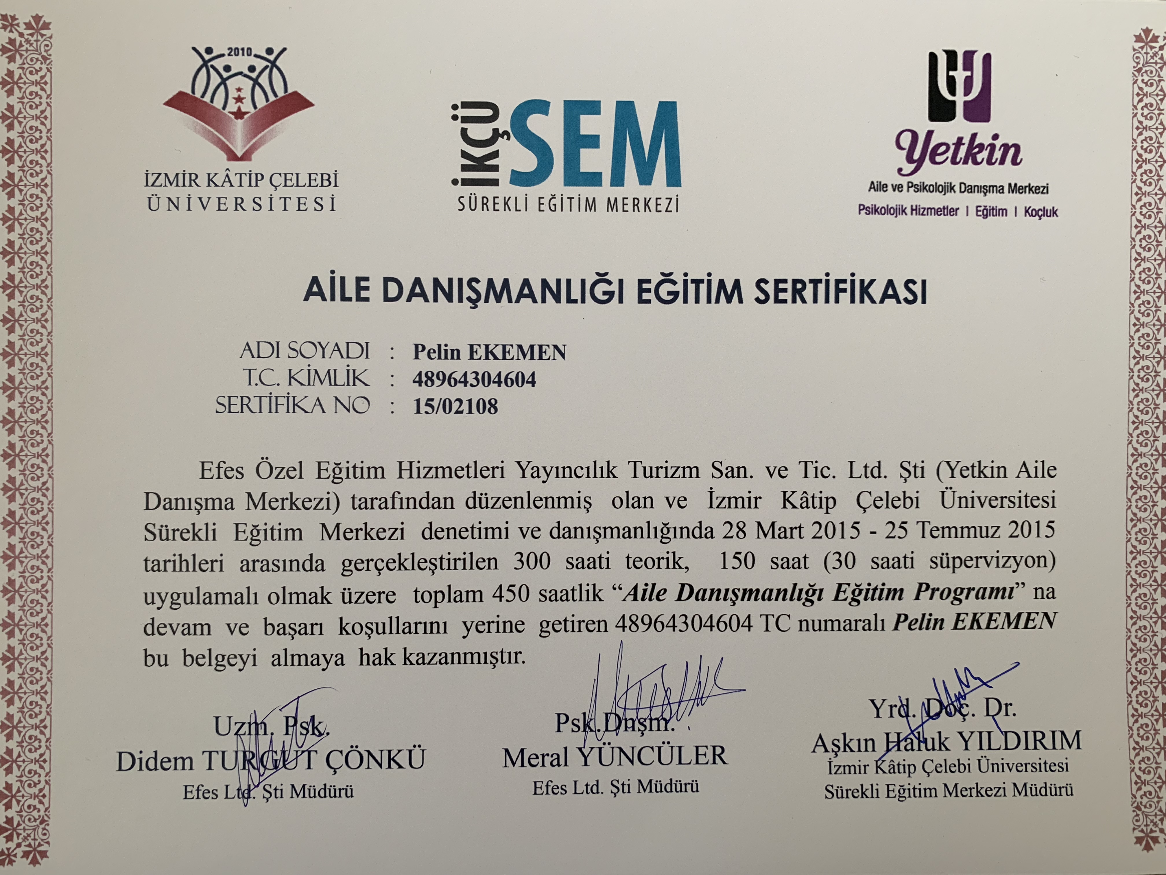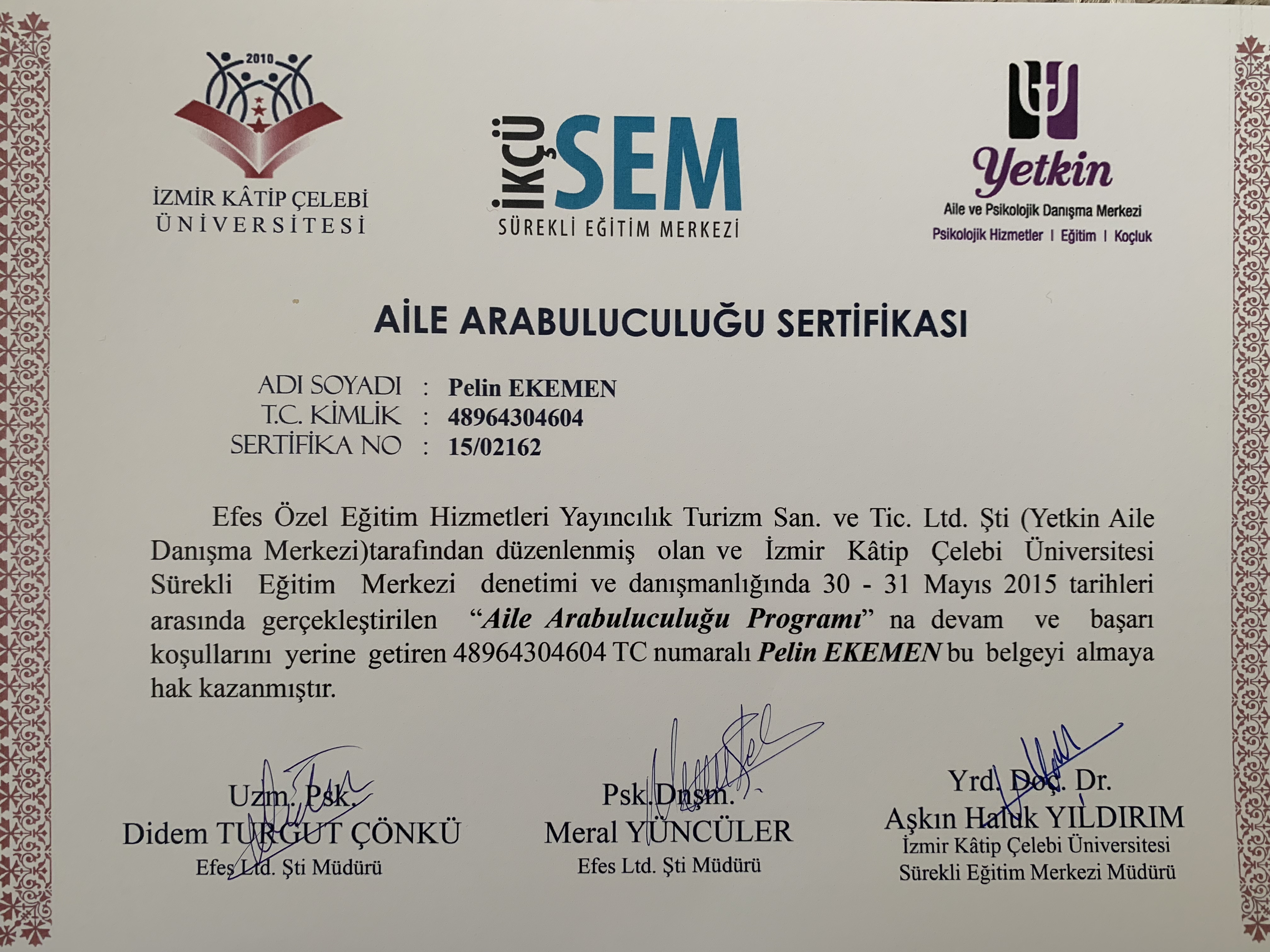 2015: İzmir Katip Çelebi Üniversitesi Aile Danışmanlığı Sertifikası